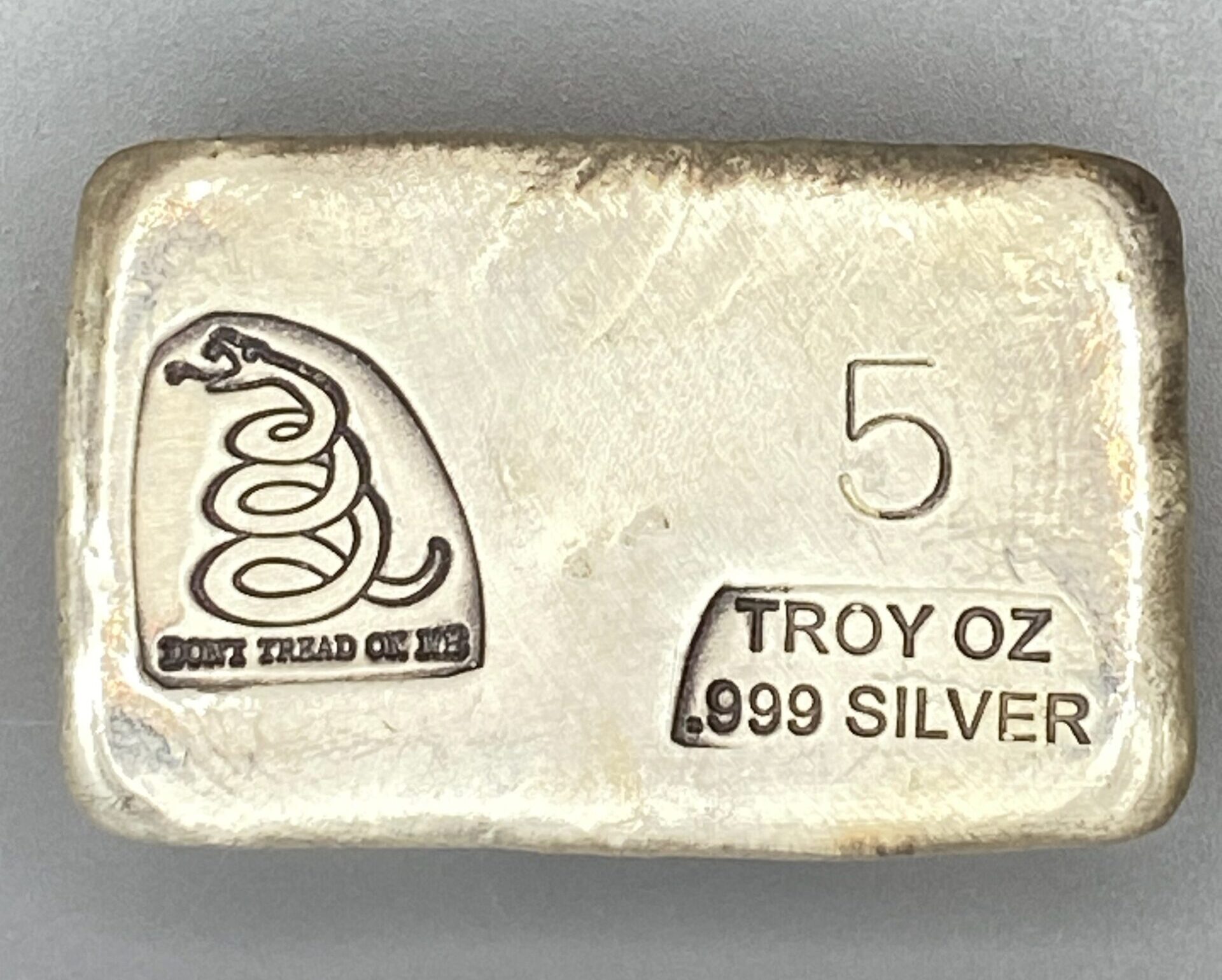 5 Troy Ounce .999 silver bar, Don’t Tread On Me stamp